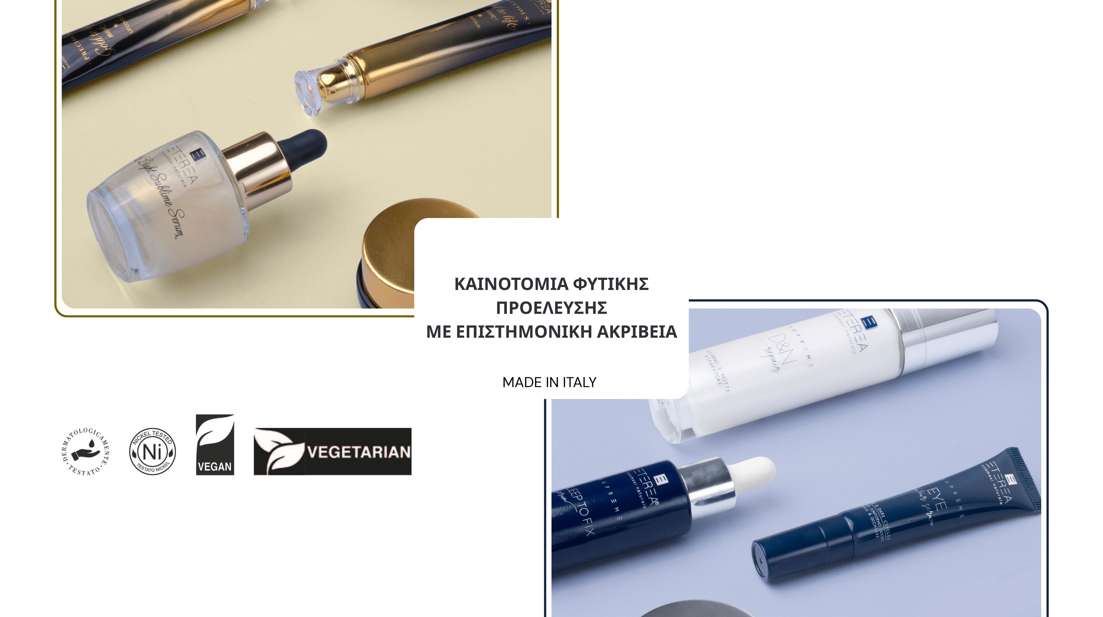 Κάθε φάση, από την έρευνα έως την παραγωγή, πραγματοποιείται εσωτερικά, διασφαλίζοντας ότι κάθε προϊόν αντικατοπτρίζει πλήρως τις αξίες της Eterea και τα ευρωπαϊκά πρότυπα. Το εργοστάσιό είναι ISO 22716:2008.